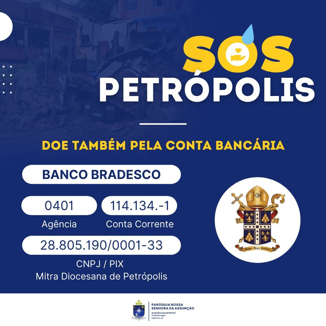Em vínculo de comunhão fraterna e profundo sentimento para com as vítimas da tragédia ocorrida em Petrópolis, informamos que aqueles que desejarem realizar alguma doação, dos tipos que estão citados na arte da postagem, podem realizar diretamente em nossa Paróquia, que por esta ocasião se torna um ponto de coleta de doações. Até o dia 25 de fevereiro, sexta-feira, receberemos todos os donativos e então, repassaremos a instituição competente que fará a distribuição aos afetados pelo desastre.