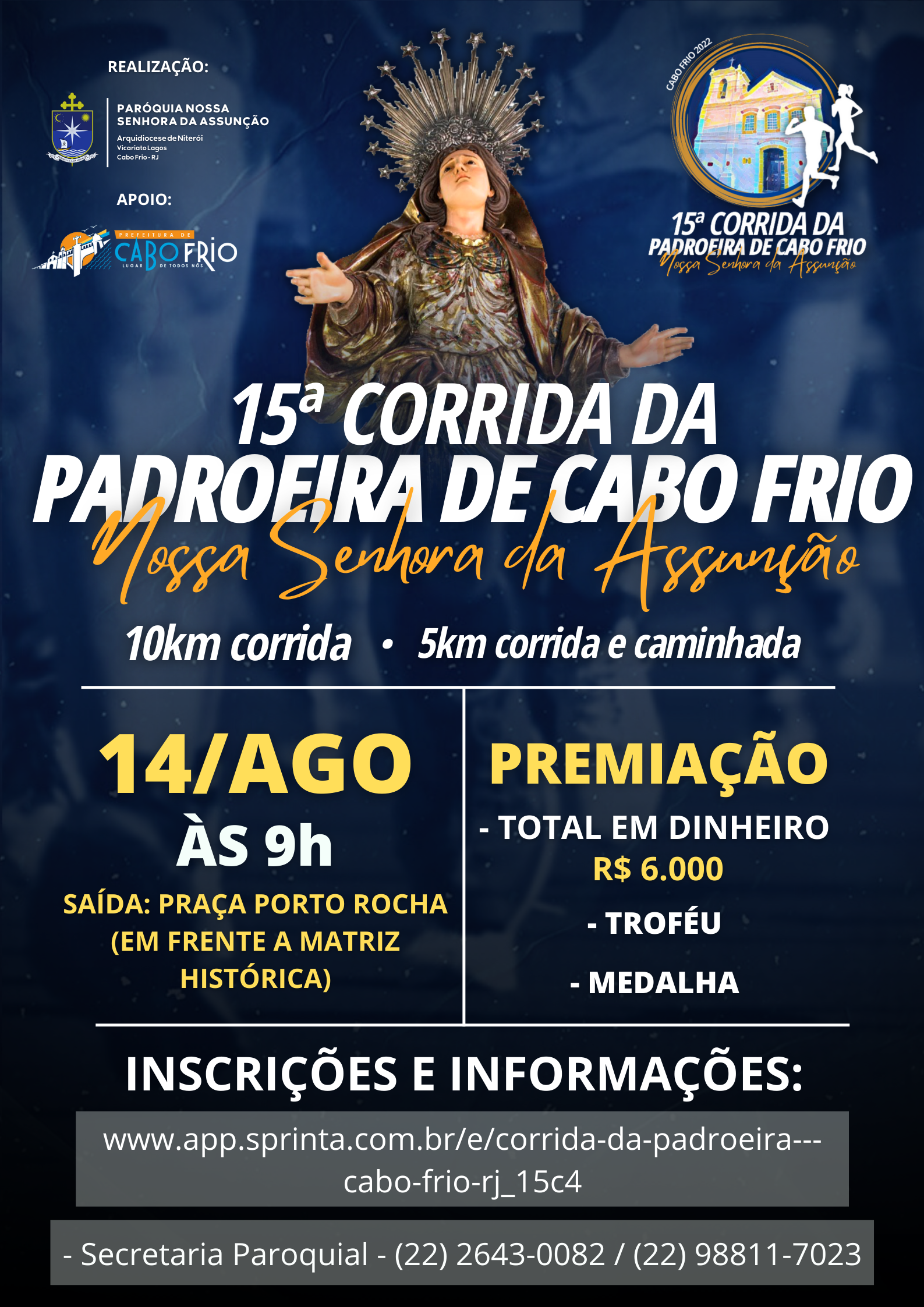 Corrida da Padroeira de Cabo Frio - Nossa Senhora da Assunção CORRIDA DA PADROEIRA DE CABO FRIO - NOSSA SENHORA DA ASSUNÇÃO A Corrida da Padroeira é uma grande festa de confraternização que une as incontáveis belezas de Cabo Frio com a prática saudável do esporte. Conta com percursos de 5 e 10km, e a caminhada com percurso de 5 km. A largada e chegada acontecerão na Praça Porto Rocha, em frente da Igreja Matriz Histórica de Nossa Senhora da Assunção. CLIQUE AQUI PARA INFORMAÇÕES DO REGULAMENTO E INSCRIÇÕES PELO LINK! FIQUE LIGADO! #corridadapadroeiradecabofrio #nossasenhoradaassunção #pnsassuncao #cabofrio