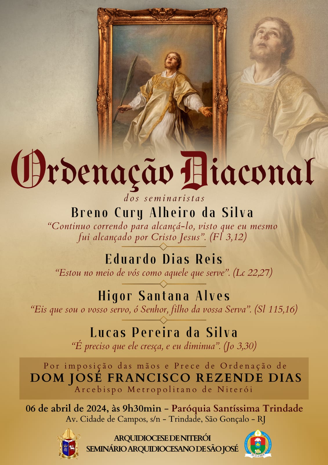 Venho convidar a todos para a cerimônia de Ordenação da minha turma na qual seremos ordenados Diáconos. A Ordenação será no dia 06 de abril às 9h30 na Paróquia Santíssima Trindade em São Gonçalo - RJ.