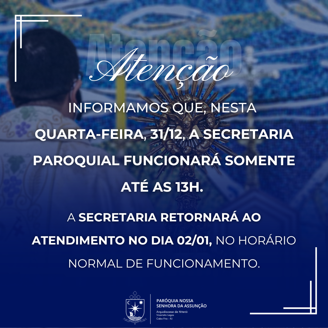 Informamos que, nesta quarta-feira, 31/12, a Secretaria Paroquial funcionará somente até as 13h.
