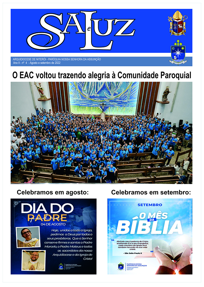 A REVISTA SAL E LUZ, da nossa Paróquia, Edição nº 4, contendo os acontecimentos dos meses de agosto e setembro, agora em forma totalmente digital, está disponível no site da Paróquia, www.pnsassuncao.org.br, na aba: REVISTA SAL E LUZ.